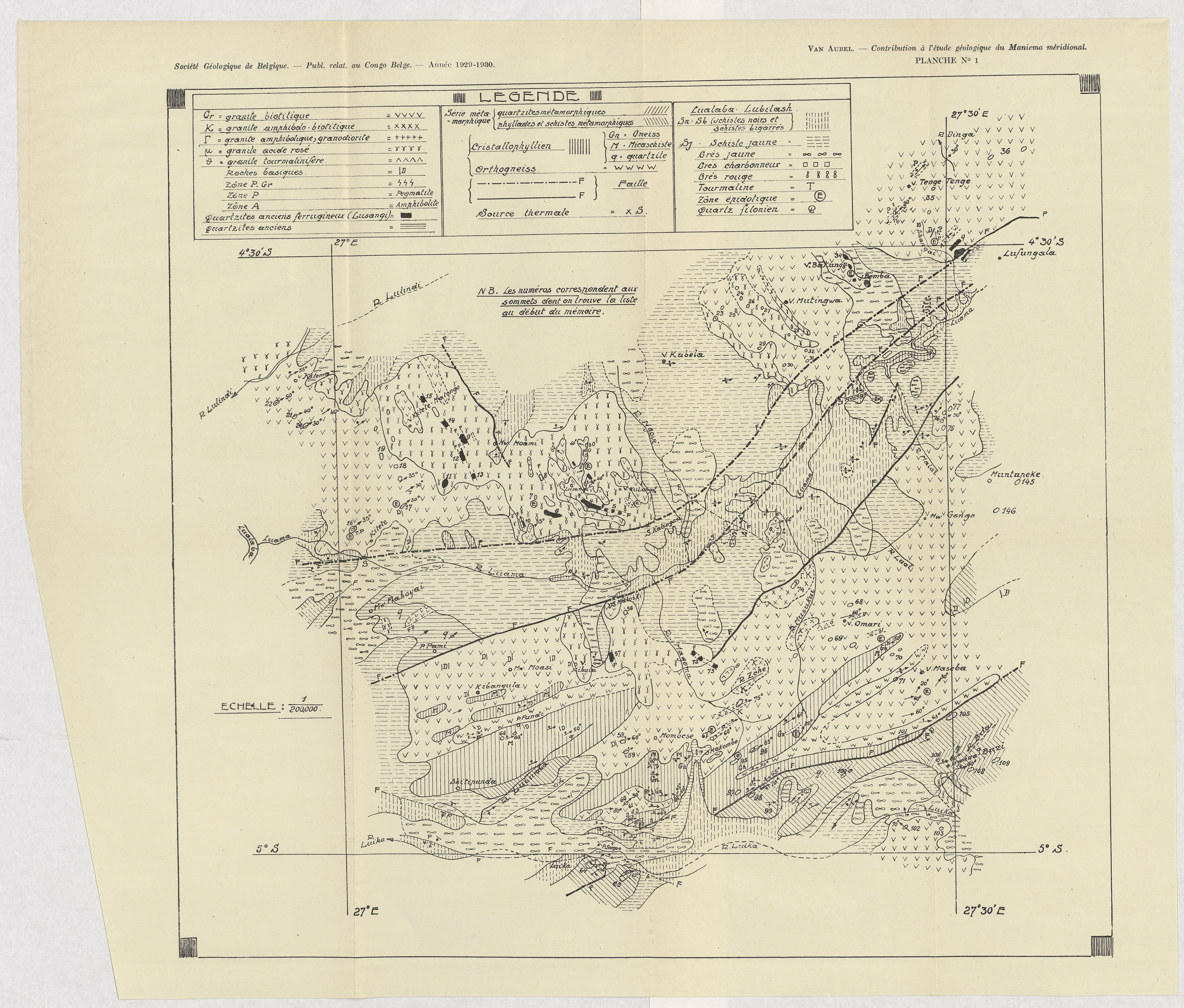René van Aubel, «Contribution à l’étude géologique du Maniema méridional», Annales de la Société géologique de Belgique [En ligne], Volume 53 (1929-1930), Publication relative au Congo Belge et aux régions voisines - fascicule 2, C141 – C247 URL : https://popups.uliege.be/0037-9395/index.php?id=6066.