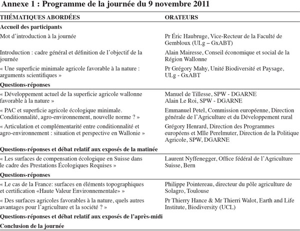 1En octobre 2011, l’Union européenne a annoncé son projet de réformer la Politique Agricole Commune (PAC) à l’horizon 2013. Un des grands changements annoncé est l’introduction d’un volet « Verdissement », prévoyant, entre autres mesures, d’imposer aux agriculteurs que : « 7 % de leurs hectares admissibles […], à l’exclusion des surfaces consacrées aux prairies permanentes, constituent des surfaces d’intérêt écologique, telles que des terres mises en jachère, des terrasses, des particularités topographiques, des bandes tampons et des surfaces boisées ». Dès son annonce, cette mesure a suscité un certain nombre de questions, le monde de la conservation de la nature y voyant une opportunité, celui de l’agriculture se sentant menacé par une contrainte supplémentaire. Afin de faire le point sur cette question et de susciter le débat autour de cette thématique, une conférence-débat, intitulée : « Nature, conditionnalité et verdissement de la PAC : un tournant wallon ? », a été organisée à Gembloux le 9 novembre 2011. Plus de 250 personnes y ont assisté, en grande partie issues du Service public de Wallonie, mais aussi, bien que dans une moindre mesure, du monde agricole, des universités, du secteur associatif, etc. Le programme comprenait huit interventions (détail à l’annexe 1) dont les deux premières avaient pour vocation de mettre la journée en contexte. Monsieur Alain Mairesse, modérateur, a commencé par cadrer l’objectif de la journée et par fixer les limites du débat. Monsieur Emmanuel Petel, représentant de la Commission européenne, a présenté le projet de réforme de la PAC, ainsi que les bases règlementaires dont est issue l’imposition de 7 % de surfaces d’intérêt écologique, en insistant sur le fait que certaines mesures obligatoires, pouvant être comptabilisées dans les 7 %, existent déjà (bandes tampons en bordure des cours d’eau). Les six autres exposés recouvraient trois objectifs principaux, faisant chacun l’objet d’une section :